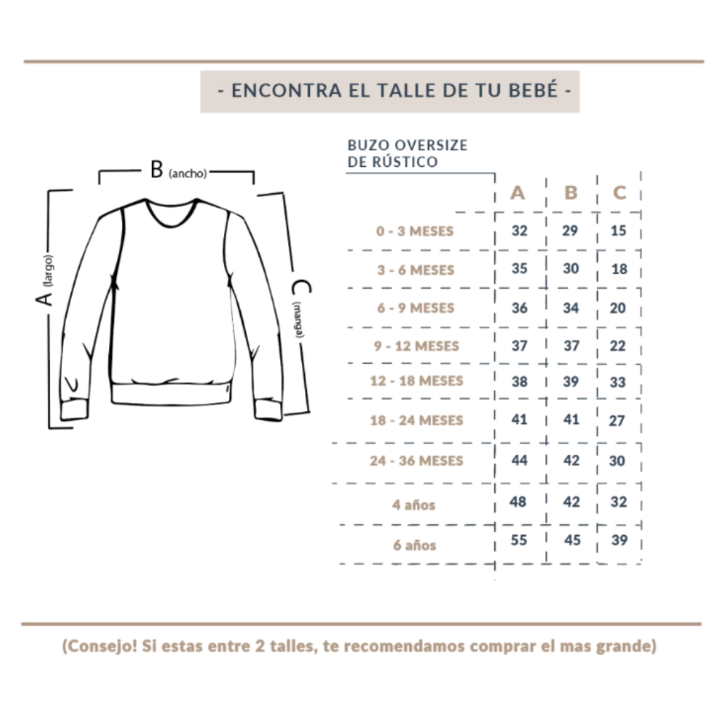 - Guía de talles: Podés utilizarla para comparar con las medidas de alguna prenda de tu bebé. Al tratarse de prendas con procesos manuales puede haber una mínima diferencia entre el producto y la tabla.