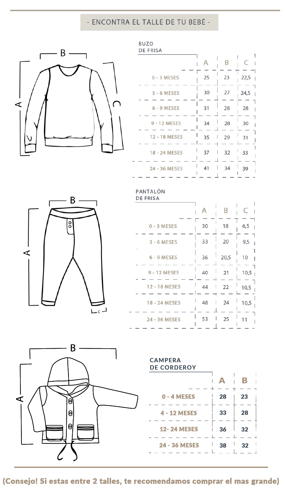 - Guía de talles: Podés utilizarla para comparar con las medidas de alguna prenda de tu bebé. Al tratarse de prendas con procesos manuales puede haber una mínima diferencia entre el producto y la tabla.