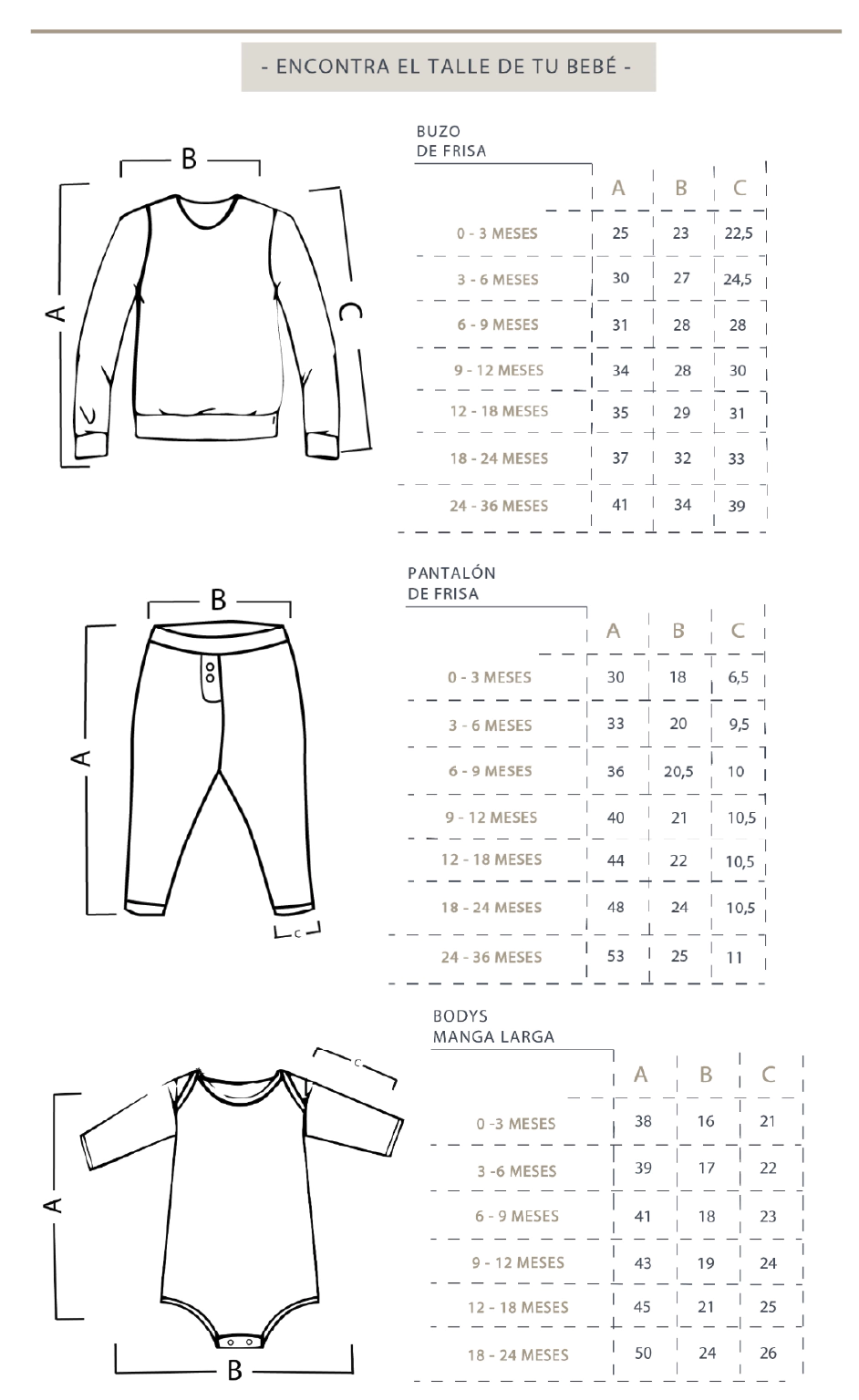 - Guía de talles: Podés utilizarla para comparar con las medidas de alguna prenda de tu bebé. Al tratarse de prendas con procesos manuales puede haber una mínima diferencia entre el producto y la tabla.